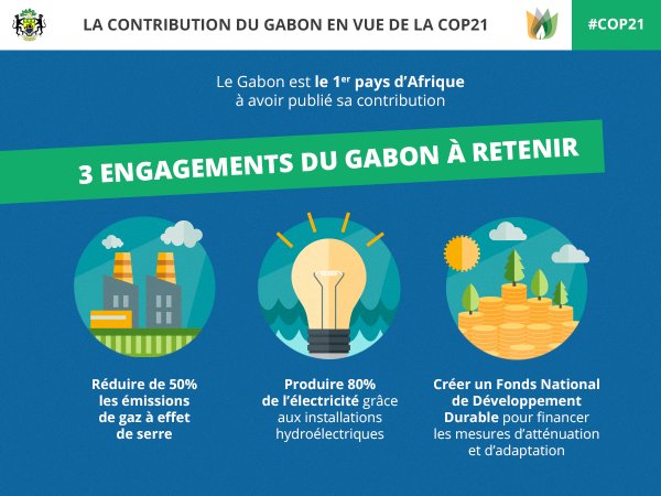 Premier pays à avoir publié sa contribution à la COP21, le Gabon a bien compris le potentiel de croissance d'une économie fondée sur des énergies propres. La contribution fixe notamment comme objectif de limiter la croissance des émissions de gaz à effet de serre pour 2025 par rapport à leur niveau de 2010. La présidence gabonaise s'engage ainsi à réduire d'au moins 50% ses émissions par rapport au niveau qui serait atteint sans changement de politique.